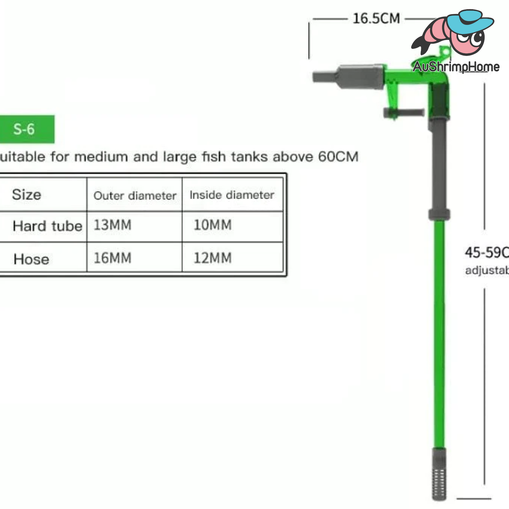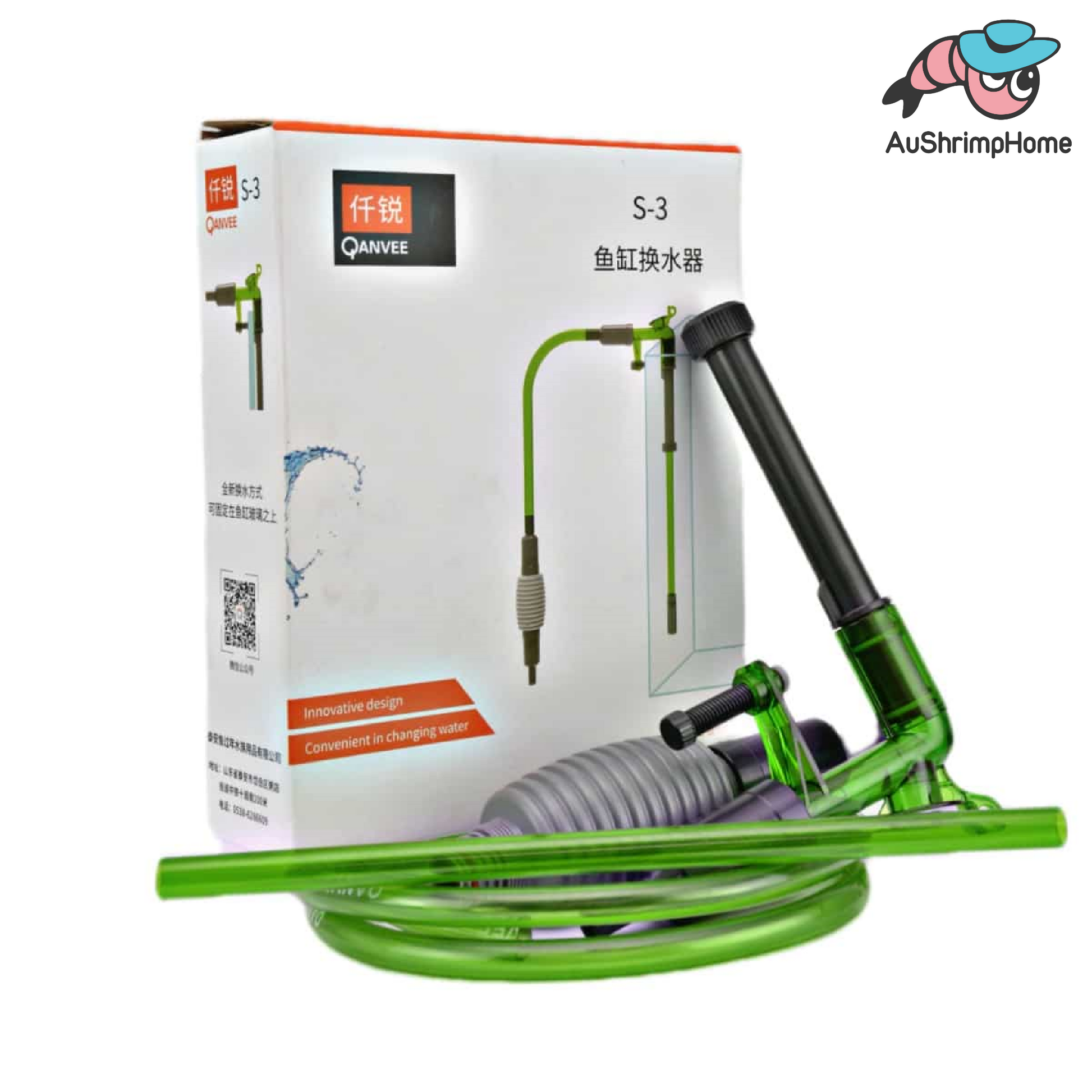 Qanvee aquarium water siphon for water exchange and cleaning of aquarium tank. Easy use manual pump initiates siphon of tank water for quick and easy water changes.
